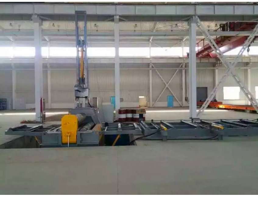 翻倒裝置由滑枕、翻倒油缸等組成。裝于翻倒機架一側,用于翻倒機架的翻轉及恢復。翻倒裝置的翻倒,便于制品沿輥子的軸向方向取出。