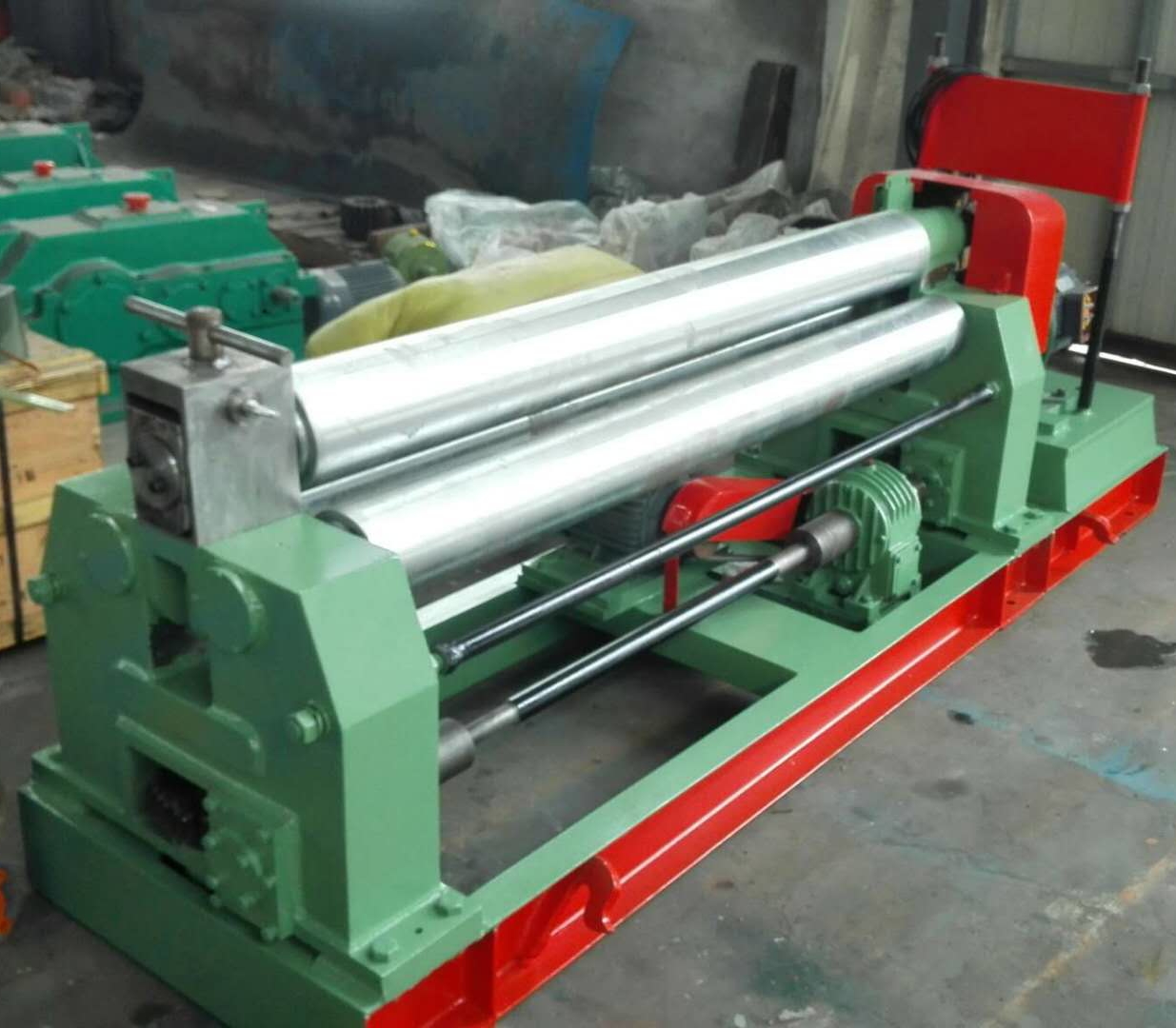機械三輥非對稱式卷板機特點:該機結構型式為三輥非對稱式,上輥為主傳動,下輥垂直升降運動,以便夾緊板材,并通過下輥齒輪與上輥齒輪嚙合,同時作為主傳動;邊輥作傾升降運動,具有預彎和卷圓雙重功能。結構緊湊,操作維修方便。
