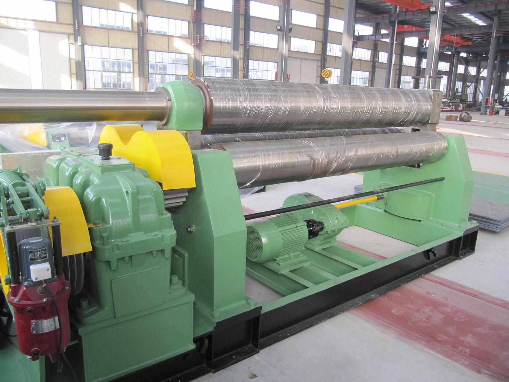 三輥卷板機有機械式和液壓式:機械式三輥卷板機分為對稱和非對稱。可將金屬板材卷成圓形、弧形和一定范圍內的錐形工件。對稱式三輥卷板機性能特點:該機結構型式為三輥對稱式,上輥在兩下輥中央對稱位置作垂直升降運動,通過絲桿絲母蝸桿傳動獲得,兩下輥作旋轉運動,由電機帶動。通過減速機的輸出齒輪與下輥齒輪嚙合,為卷制板材提供扭矩。